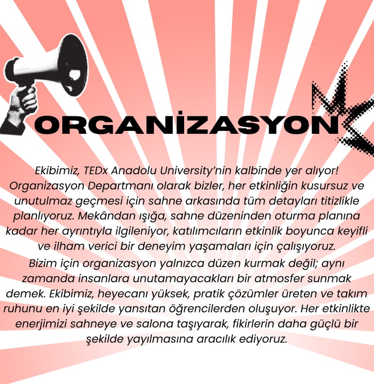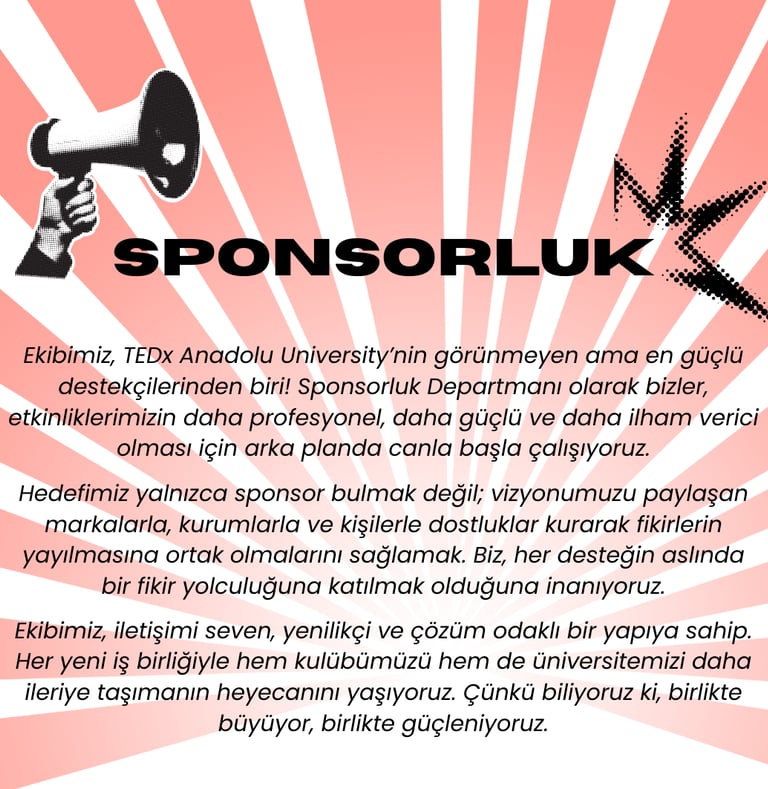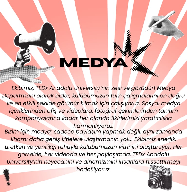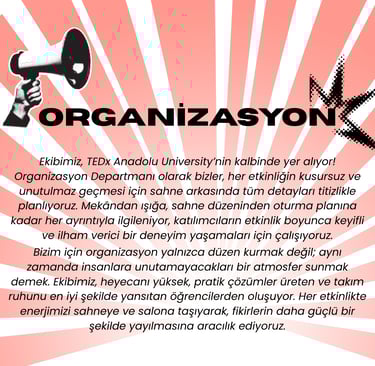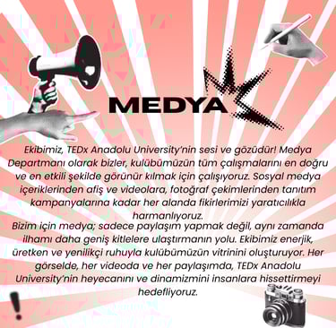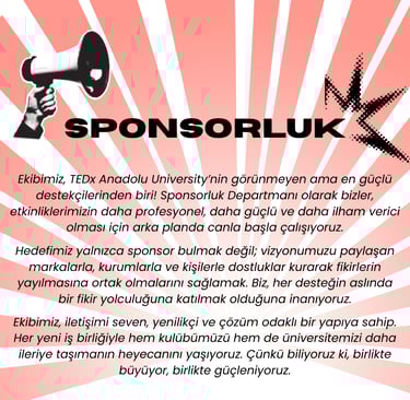 TEDx Anadolu University olarak vizyonumuz, gençlerin fikirleriyle dünyayı değiştirebileceğine inanan ve bu inancı somut adımlara dönüştüren bir topluluk olmaktır. Geleceğe yön veren, yaratıcı çözümler üreten ve farklı bakış açılarını bir araya getirerek çeşitliliği güç kaynağına dönüştüren bir öğrenci kulübü olmayı hedefliyoruz. Amacımız yalnızca üniversite sınırları içinde değil, ulusal ve uluslararası ölçekte de fikirlerin yayılmasını sağlayan bir köprü olmak. İlham veren konuşmalar, yenilikçi projeler ve katılımcı bir topluluk ruhu ile Anadolu Üniversitesi’ni TEDx kültürüyle tanıştırarak, gençlerin yalnızca bugünün değil, geleceğin de liderleri olmalarına katkıda bulunmayı amaçlıyoruz.